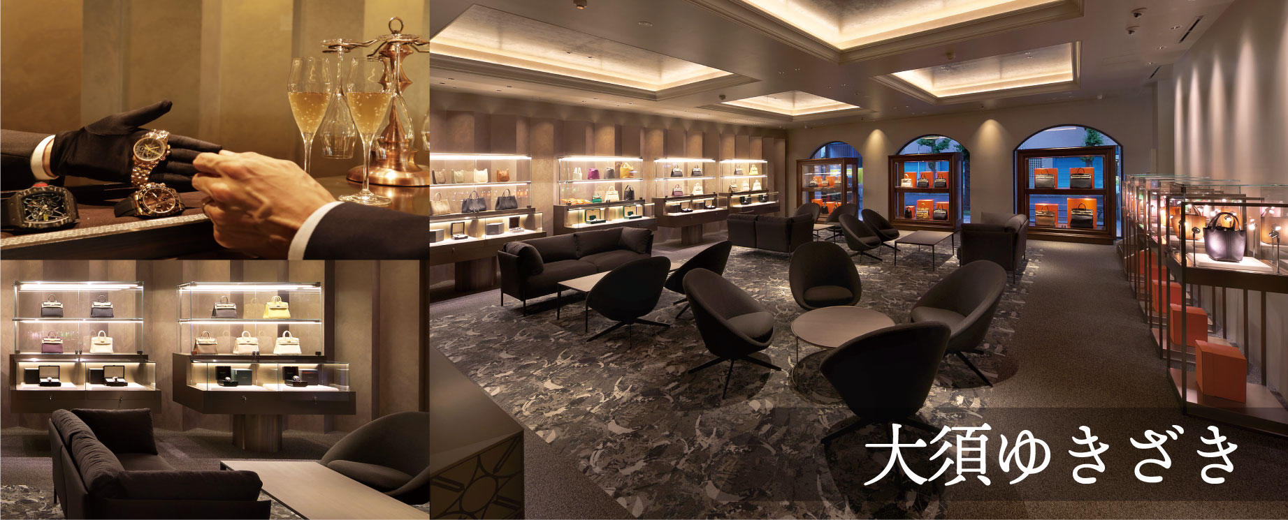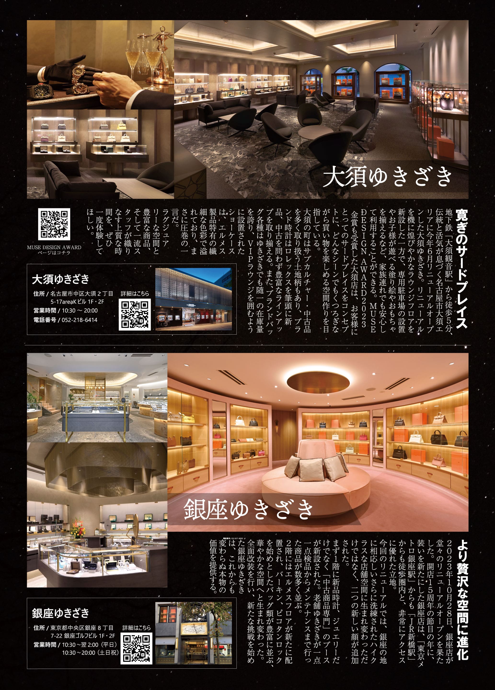 寛ぎのサードプレイス 地下鉄「大須観音駅」から徒歩5分、伝統と活気が息づく名古屋市大須エリアに今年6月リニューアルオープンした大須ゆきざき。リニューアルを機に煌びやかなラウンジフロアを新設した一方で、専用駐車場の設置やお子様が遊べる塗り絵やおもちゃを揃えるなど、家族連れでも安心して利用することができる。MUSE ÐESIGN AWARD2023 金賞も受賞した大須店は、お客様にとってのサードプレイスをコンセプトに、どんなシーンでもくつろぎながら買い物を楽しめる空間作りを目指している。 大須の町はサブカルチャー・中古品を多く取り扱う土地柄もあり、ブランド時計はロレックスを筆頭に新品、中古を問わず豊富なラインアップを取り揃える。また、ブランドバッグ各種はゆきざきでも随一の在庫量を誇り、VIPラウンジを囲むように設置されたショーケースは、エルメス製品特有の繊細な色彩で溢れており、まさに圧巻の一言だ。 ラグジュアリーな空間と豊富な商品、そして一流スタッフが織りなす上質な時間を、ぜひ一度体験してほしい。